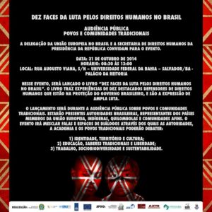 Nesta sexta-feira, 31 de outubro, será realizada a Audiência Pública Povos e Comunidades Tradicionais. O evento acontecerá na Reitoria da Universidade Federal da Bahia (UFBA),