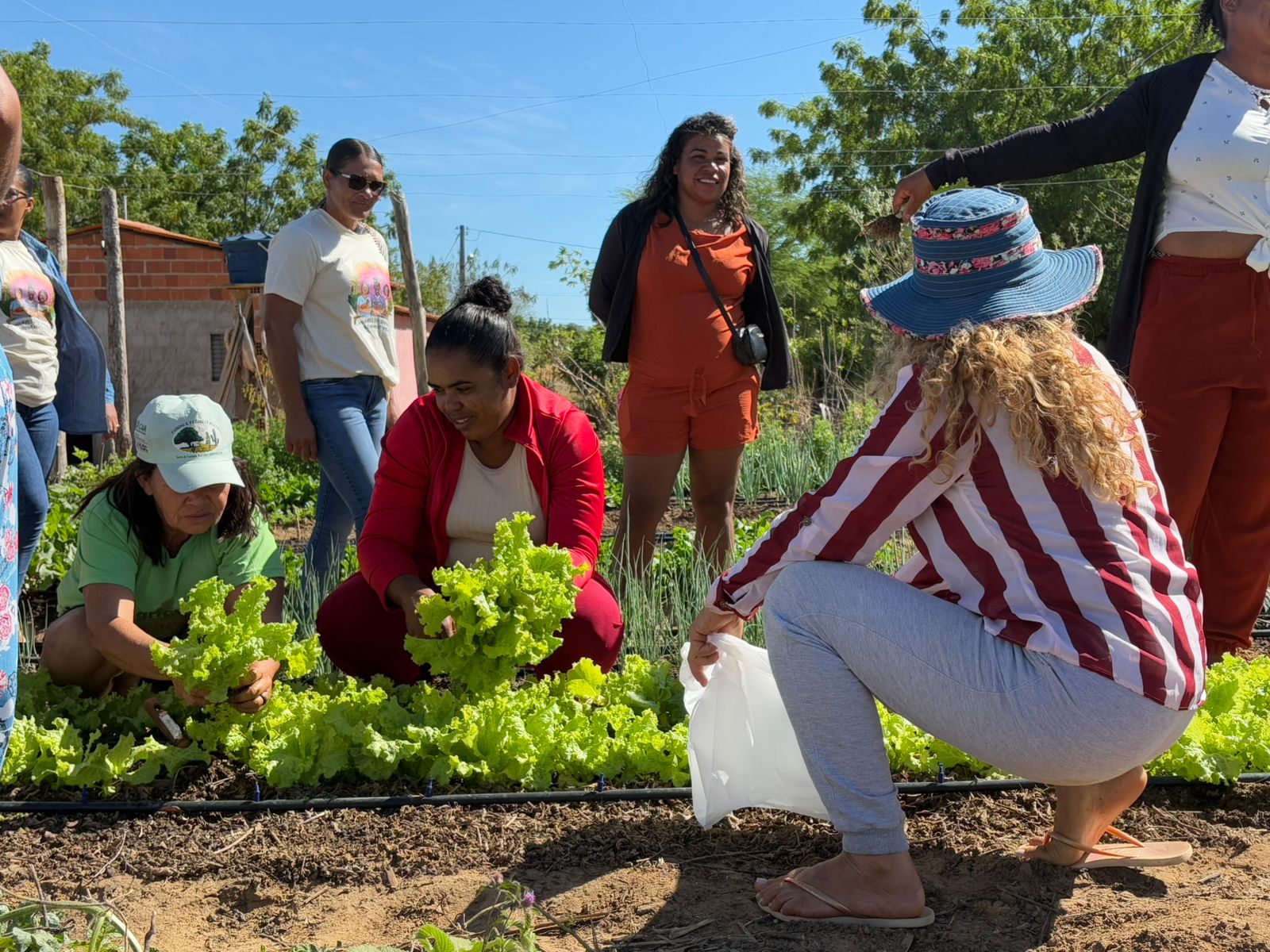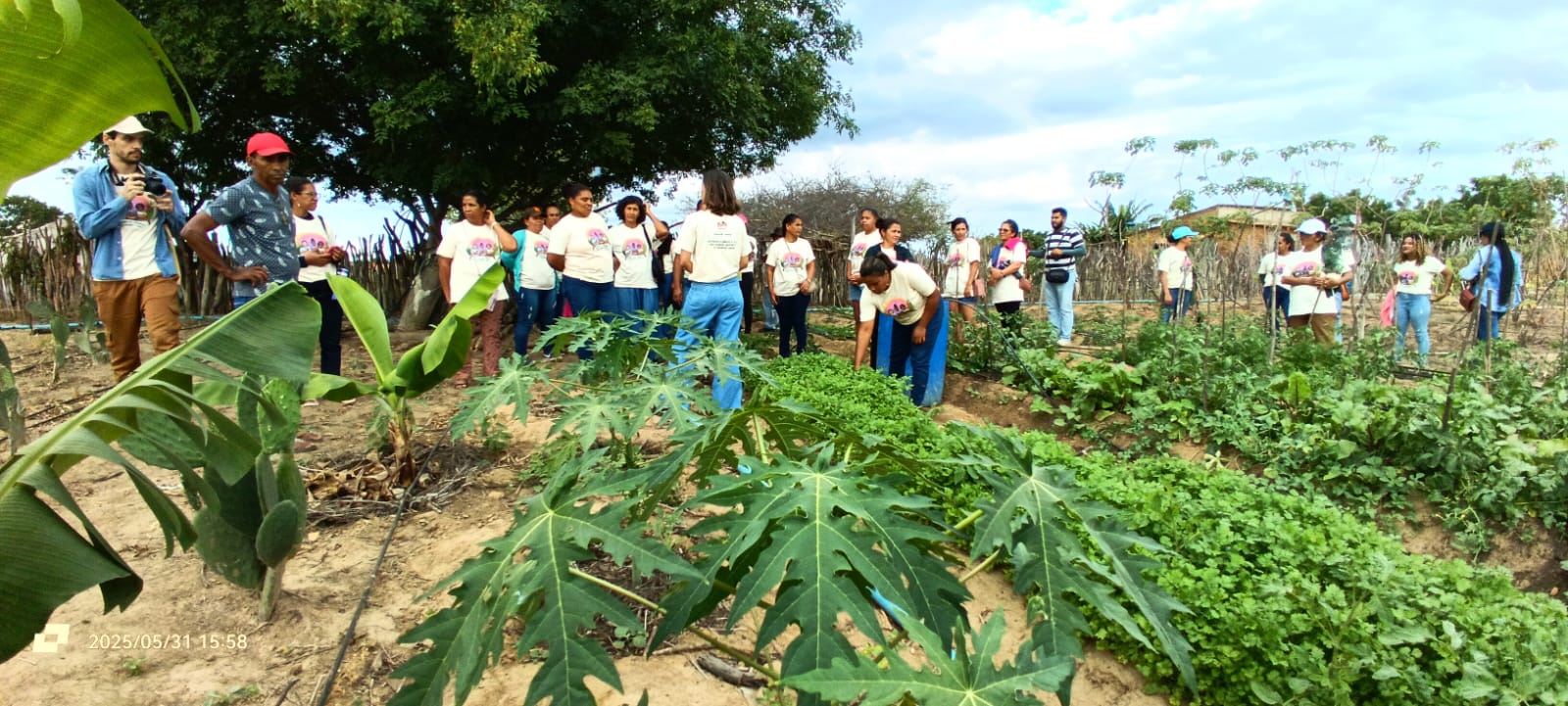 No segundo dia, a visita foi à horta comunitária localizada em Campo Alegre, conduzida por um grupo misto de mulheres oriundas de diferentes comunidades vizinhas. Com apenas dois meses de implementação, a horta já apresenta bons resultados e inicia a colheita de seus primeiros alimentos, fruto da ação coletiva e da agroecologia como base de autonomia e segurança alimentar.