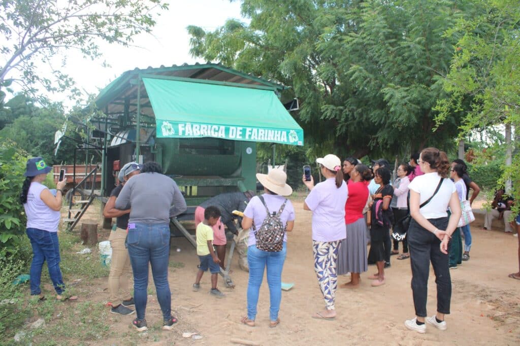 Mulheres de Santa Maria da Vitória, Ibotirama, Muquém do São Francisco, Irecê e Itaguaçu da Bahia visitaram na comunidade Palmeiras, município de Central,  unidades produtivas orgânicas que fazem parte do núcleo Raízes do Sertão, integrante da Rede Povos da Mata na Bahia; a Unidade de Beneficiamento de Derivados de Mandioca e a fábrica de farinha móvel da comunidade quilombola Barreiros, em Itaguaçu da Bahia. Além de conheceram como funciona a organização da associação de Barreiros, colocaram, literalmente, a mão na massa experimentando receitas culinárias.